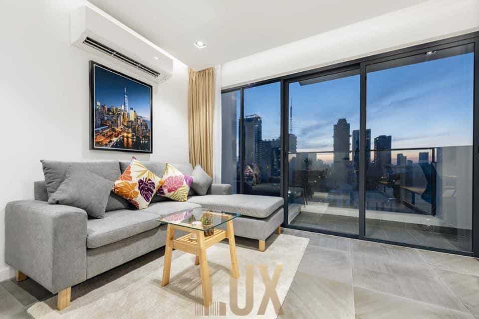 The apartment boasts a spacious, open-plan living area awash with natural light, streaming in through floor-to-ceiling windows that frame the dynamic city skyline. The living space is meticulously designed to balance comfort and style, featuring contemporary furnishings, a soothing neutral color palette, and an elegant design.