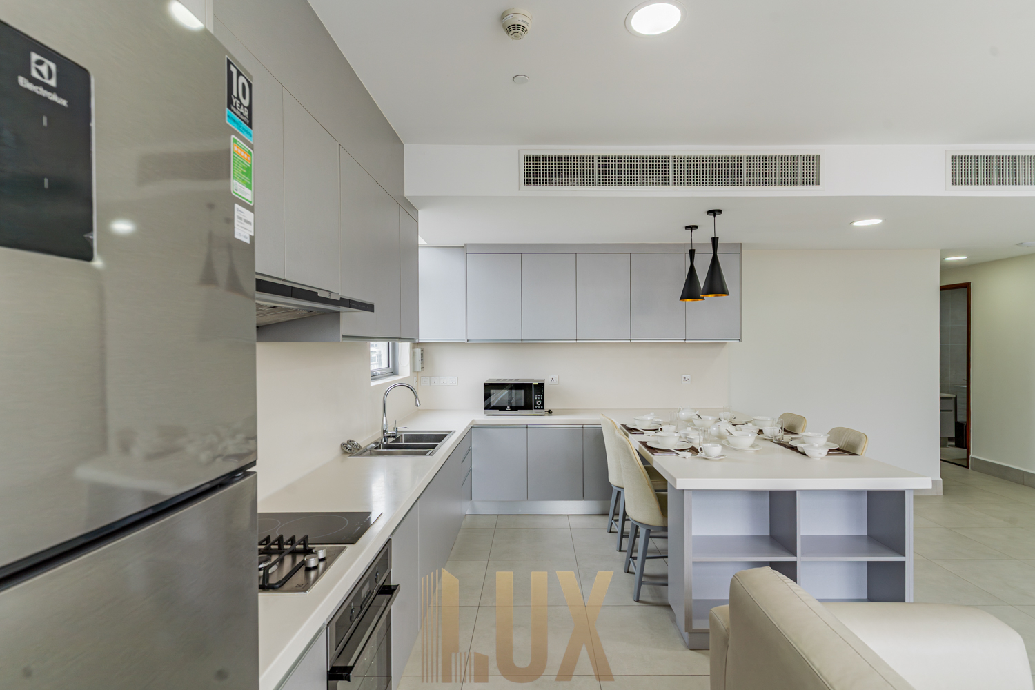 The apartment features a generous open-plan living and dining area with large windows that bring in natural light and frame the surrounding skyline. The kitchen is fully equipped with clean, modern cabinetry and a functional island setup, making it suitable for both daily living and casual entertaining. Both bedrooms are well sized and thoughtfully arranged, each supported by its own bathroom, offering privacy and comfort for residents or guests.