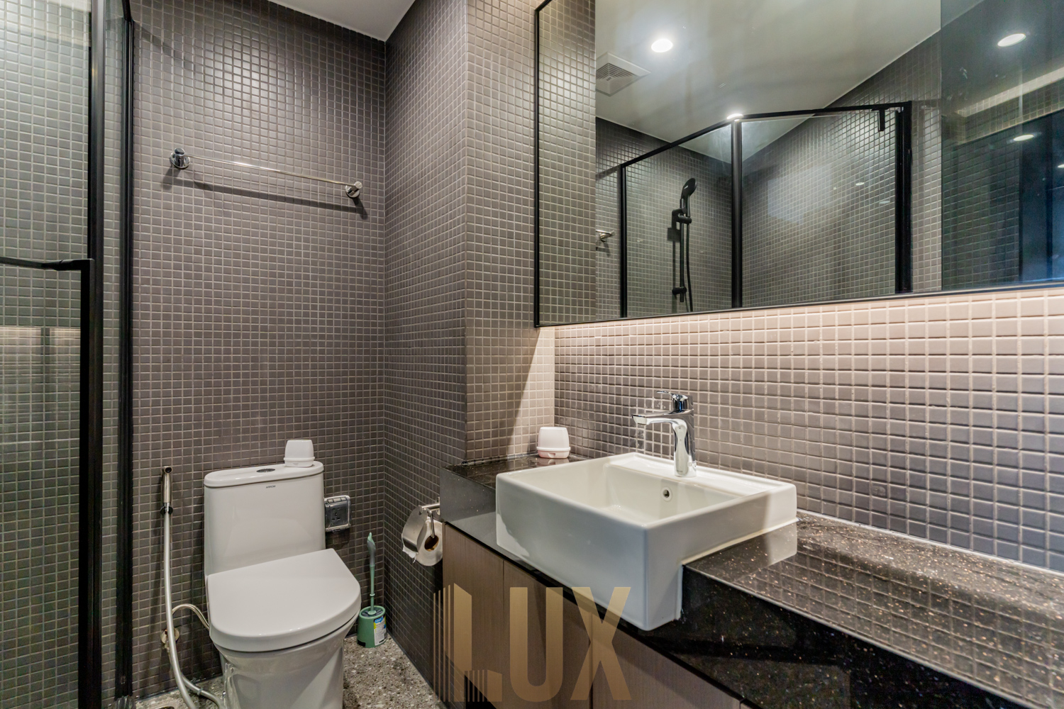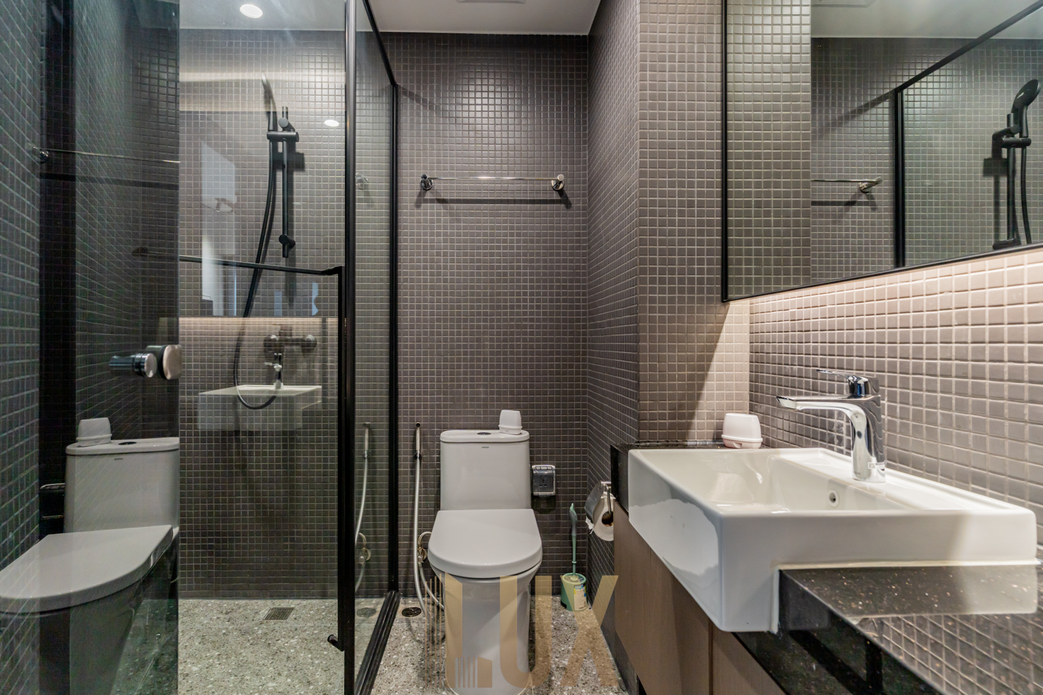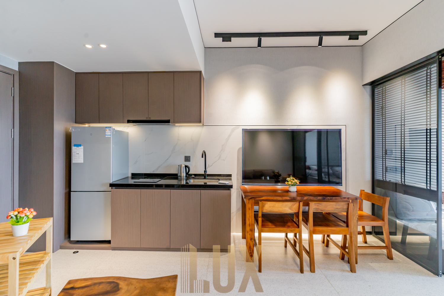 Within the main hall is an kitchen fully equipped with a refrigerator, a built-in induction cooker, exhaust hood and sink; a three-seater wood dining table; and a gray sofa set complemented by a mounted flatscreen TV. The balcony at the end of the hall ensures a steady flow of natural light, and residents can slide the doors open for a dose of fresh air and to gaze around at the surrounding city views. Tenancy at City View also unlocks for you access to a gym, swimming pool and recreational activity area, which makes this 2-bedroom abode also a good choice for a new family with one (1) child.