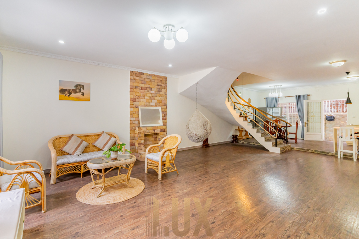 Find laidback living in this villa for rent, a gated residence consisting of three (3) bedrooms, a spacious main hall suitable for gatherings and socialiazation; and a charming kitchen and dining corner equipped with a U-shaped counter with a built-in stove as well as a large refrigerator and even washing machine nearby for daily convenience, especially with the utility space accessible right by the kitchen counter. These are complemented by generously sized bedrooms and modern bathrooms, which together provide a cohesive and comfortable abode perfect for a medium-sized family. Add to that the luxury of a gated yard with paved parking and integrated greenery, and you’ve got yourself a delightful home environment.