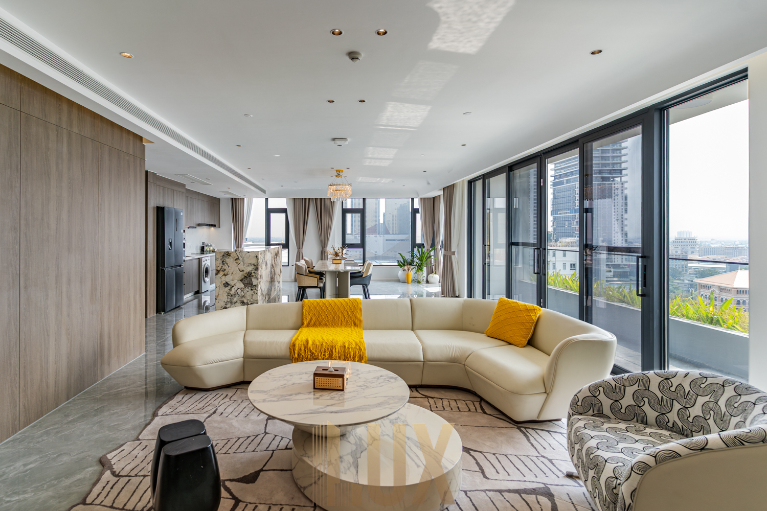 This penthouse serviced apartment for rent in Tonle Bassac offers generous space, clean modern finishes, and elevated city views from the 20th floor. Designed with open-plan living in mind, the layout flows comfortably from the living area to the dining space and fully equipped kitchen, making it easy to live and entertain without feeling crowded.