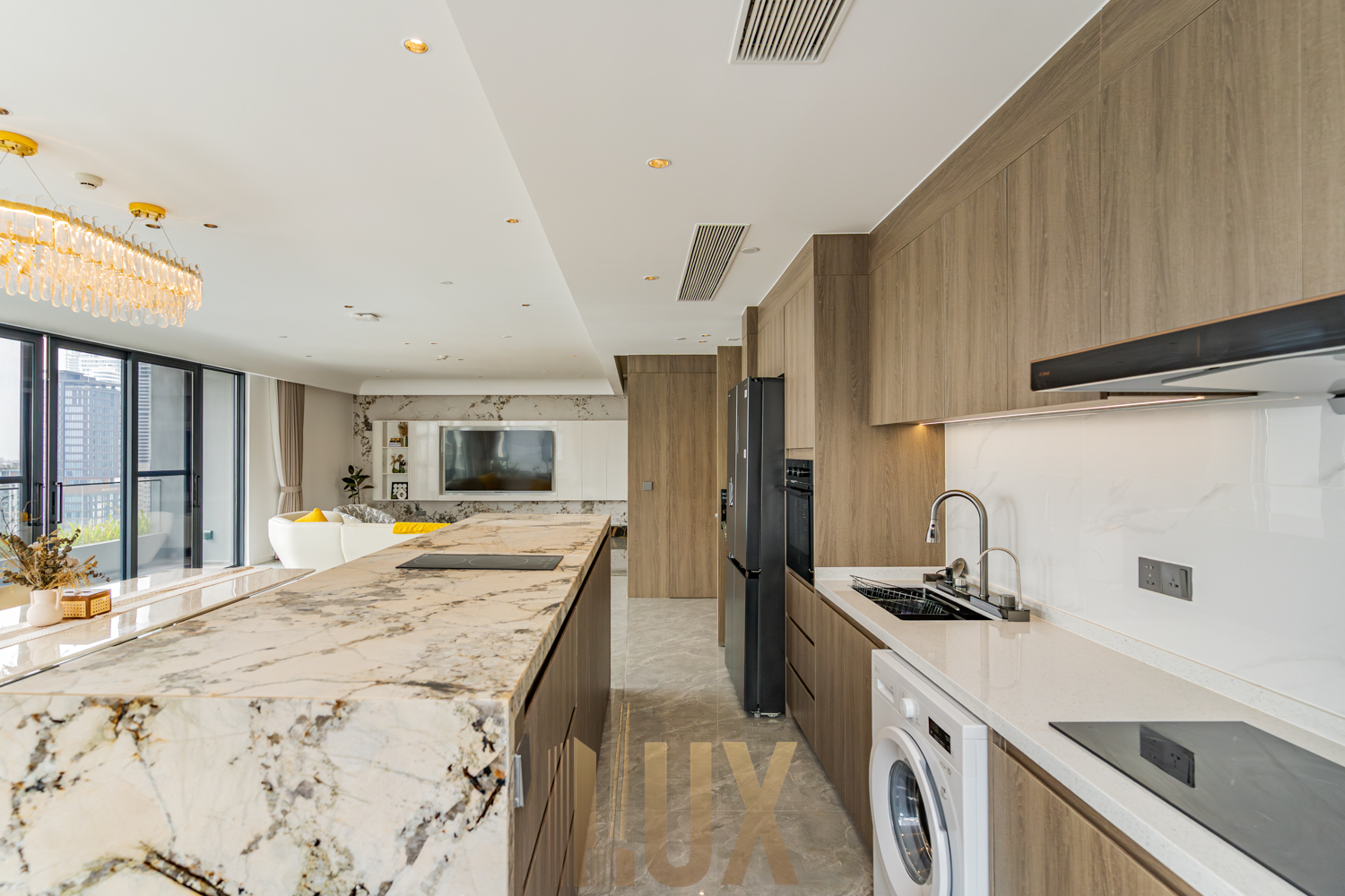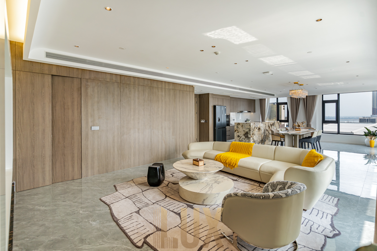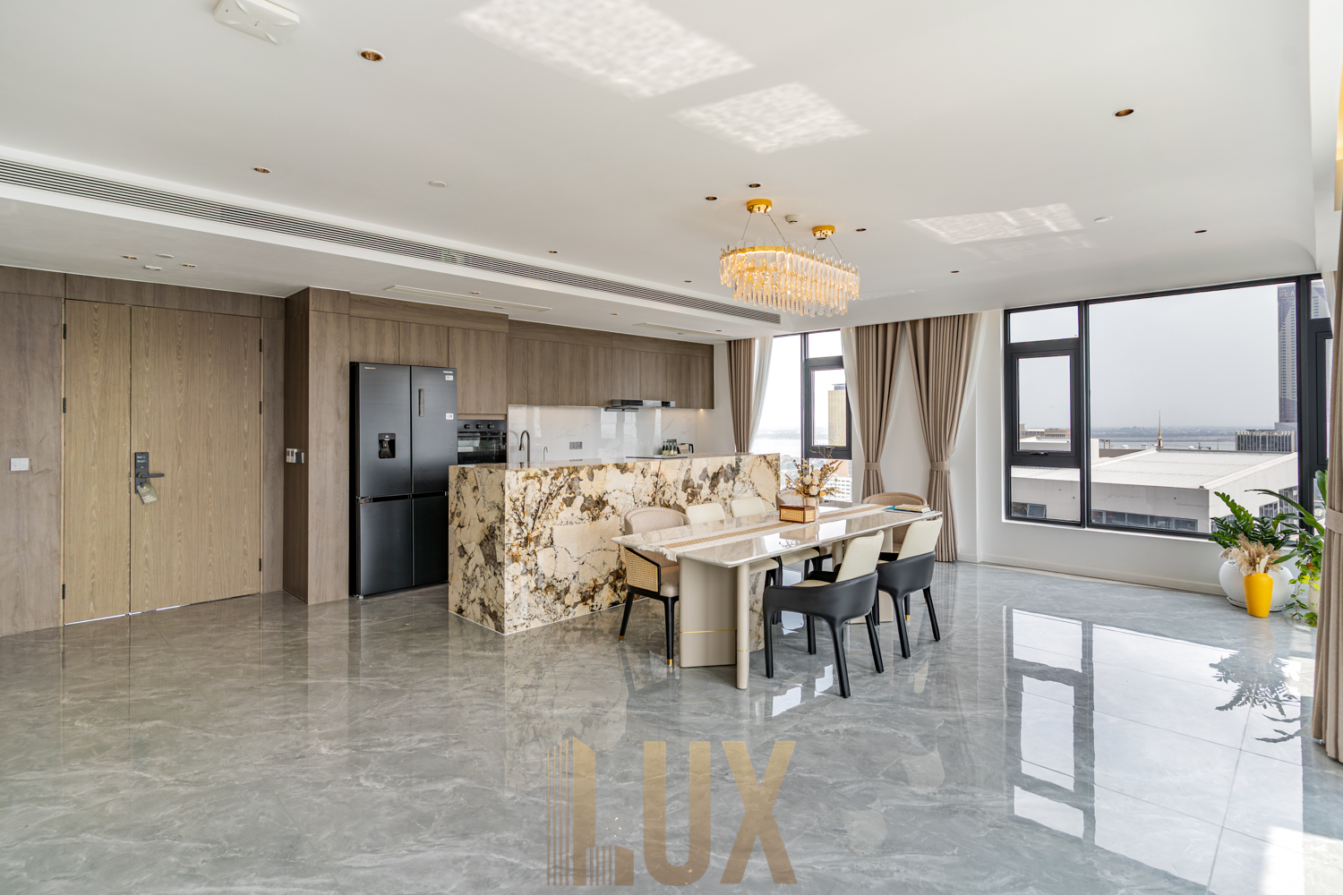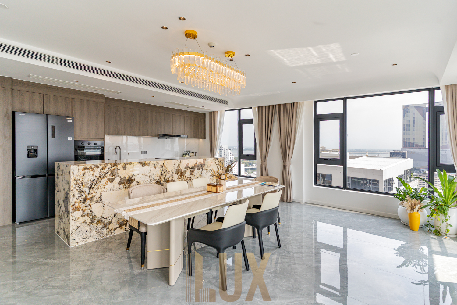 The living and dining area is bright and spacious, framed by large windows that bring in natural light and open city views. A marble-accent kitchen island anchors the space, paired with quality cabinetry and built-in appliances that suit everyday use.