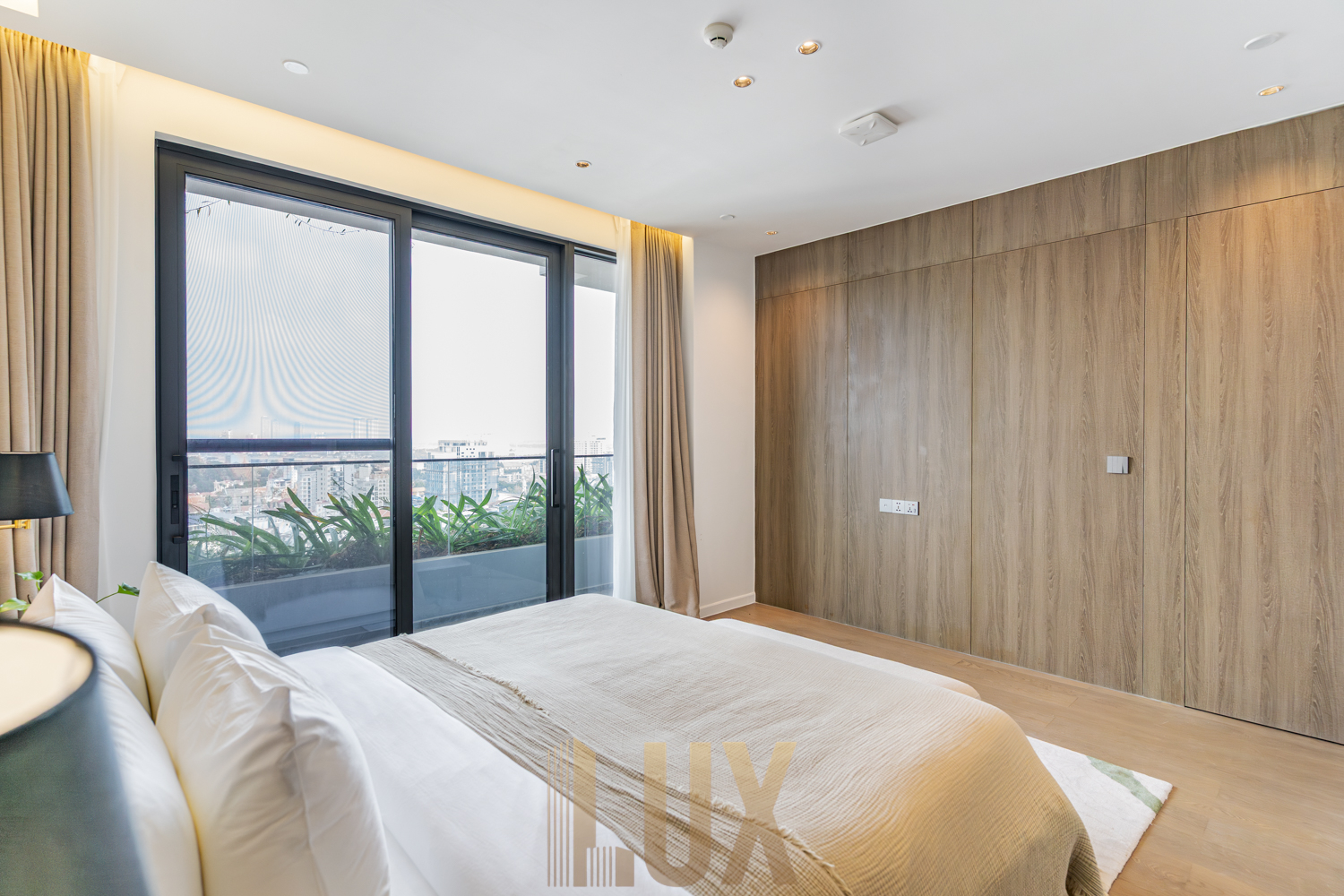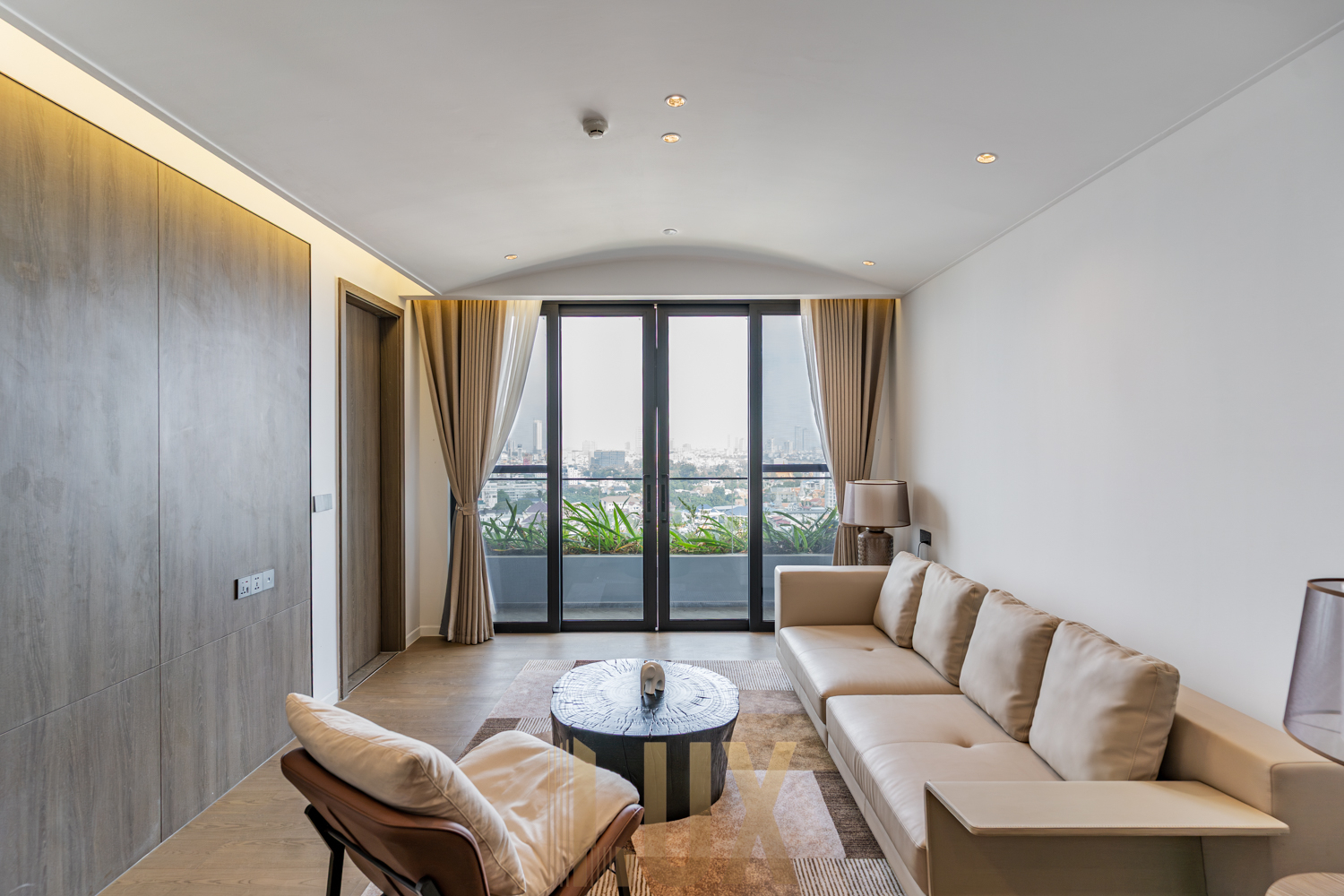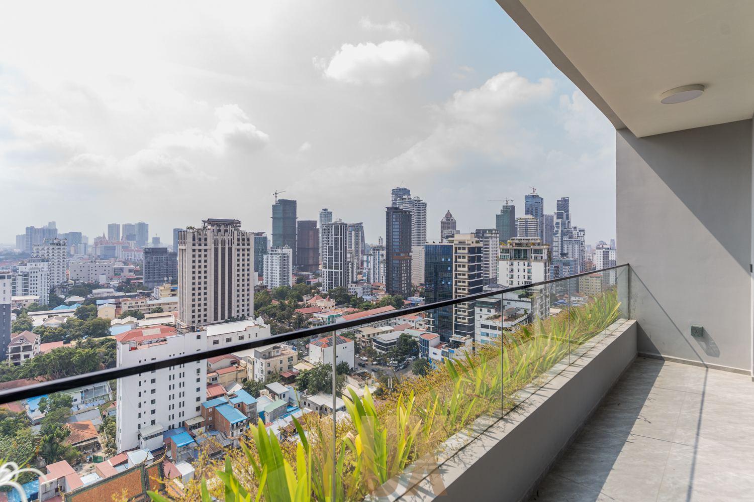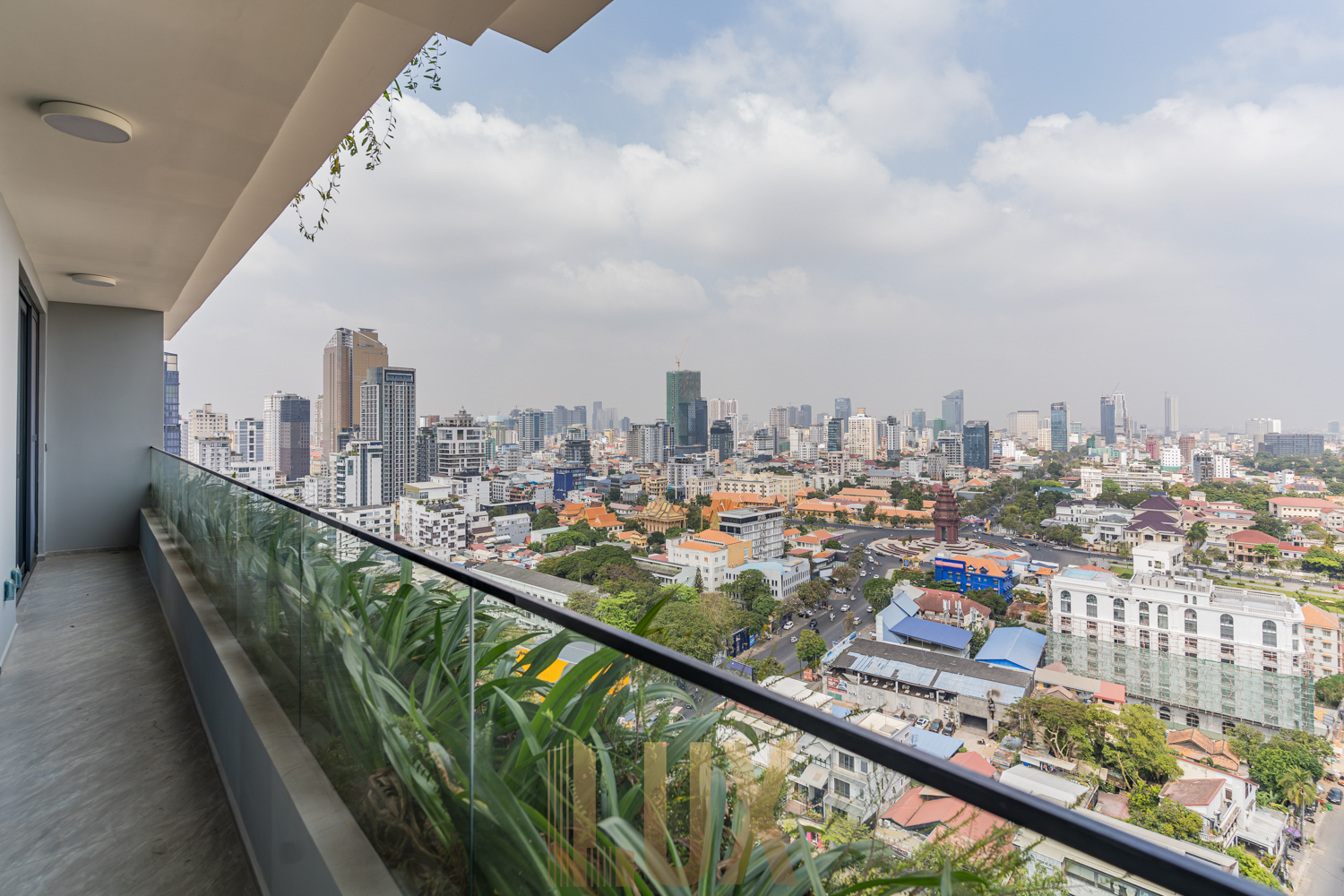 A private balcony extends the living space outdoors, offering a clear vantage point over Tonle Bassac and surrounding neighborhoods.