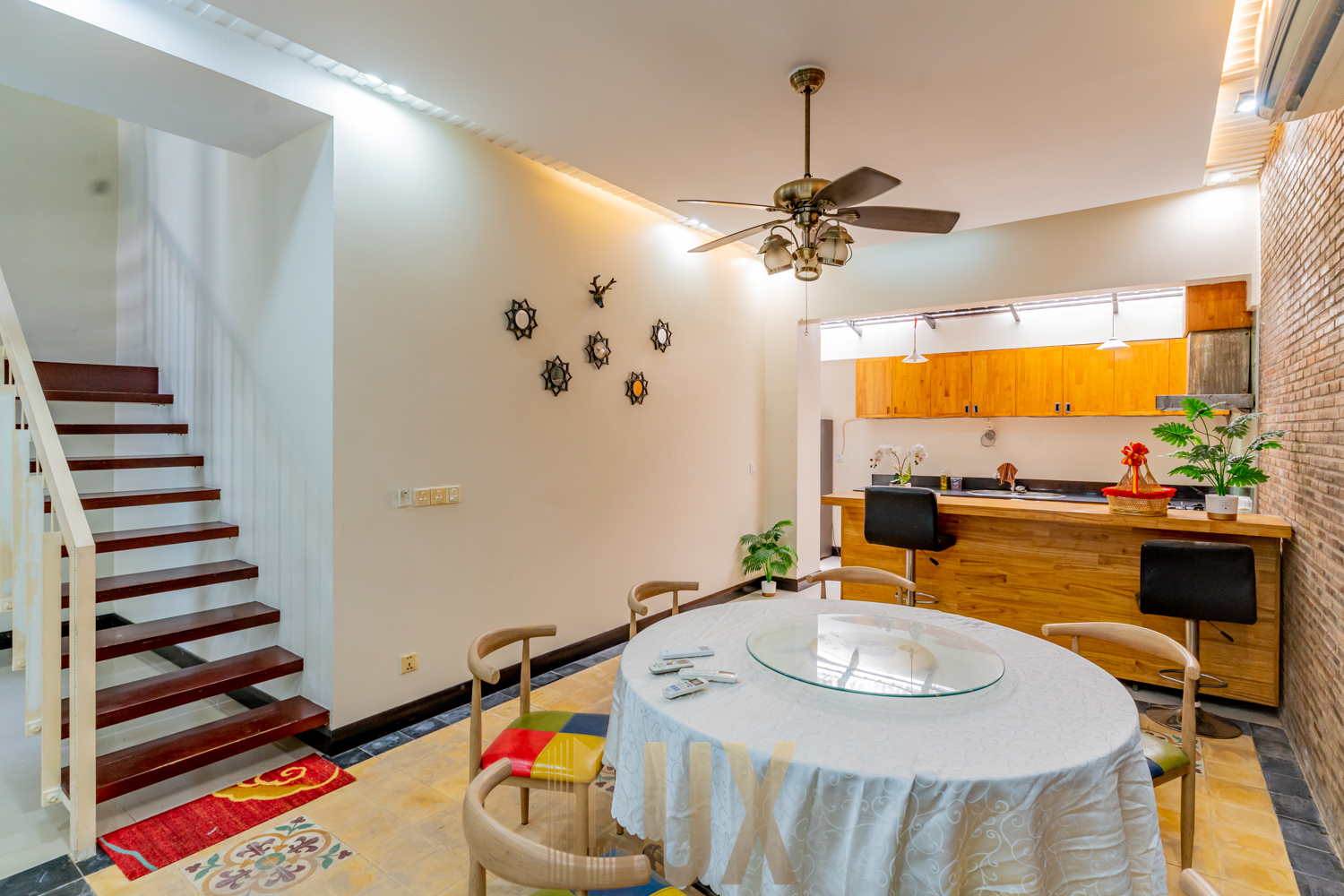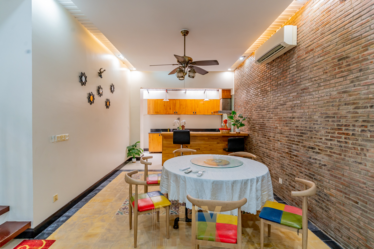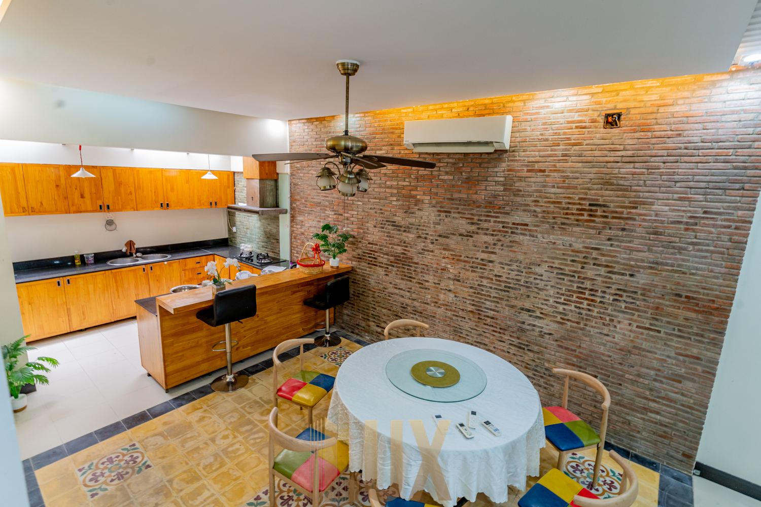 With a total of five (5) bedrooms, this is a supreme choice for family living especially with a large household. There are four (4) bedrooms upstairs and two (2) rooms on the ground floor which can easily be converted into a private living room as well as a maid’s room. You’ll love the wide galley kitchen, which comes with plenty of built-in shelving, and an L-shaped utility counter with integrated exhaust, cooker, oven, and more storage compartments. The sink is also positioned on what is the lower level of a breakfast nook, providing both a light division between kitchen and dining/living space while also ensuring maximum space efficiency. While the unit is currently fitted with basic essentials like the above-mentioned appliances, a sofa set, dining table, desks, and beds, it’s easy to imagine decorating it mid-century modern style to complement the hardwood flooring, monochromatic walls, and granite-texture accents that already give this abode an elegant atmosphere.