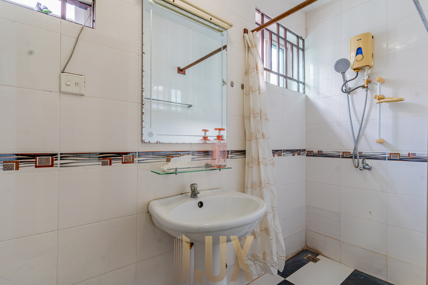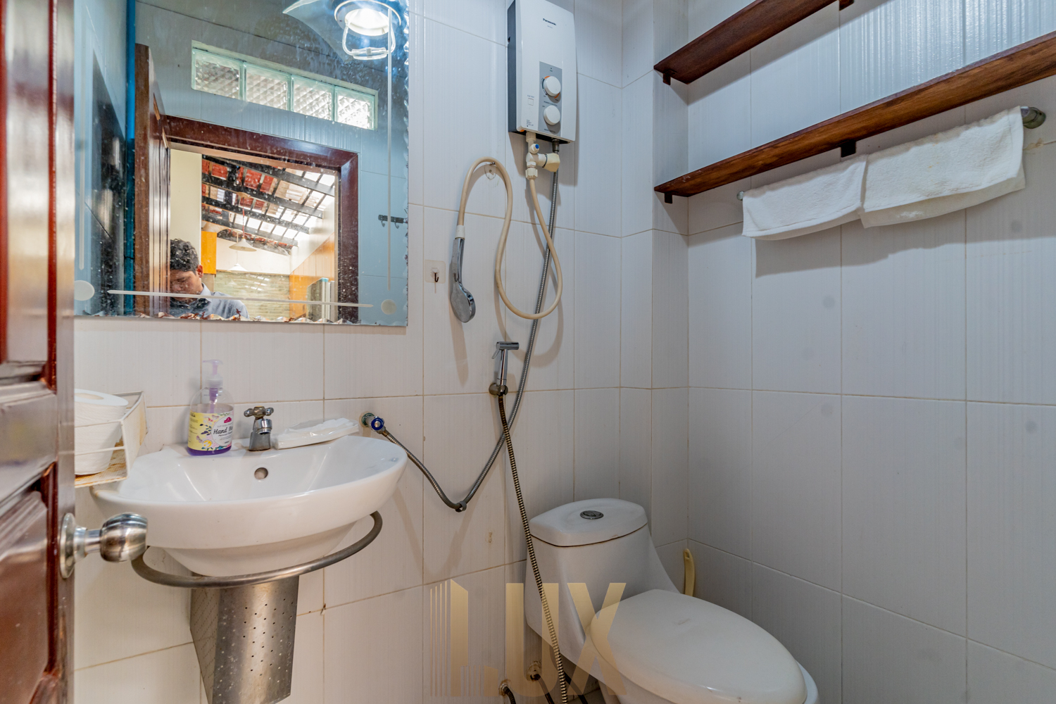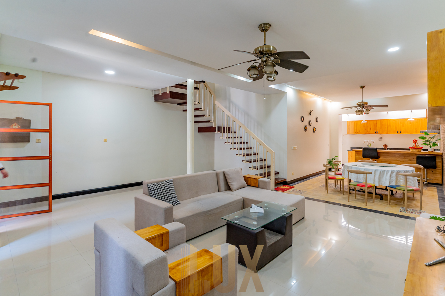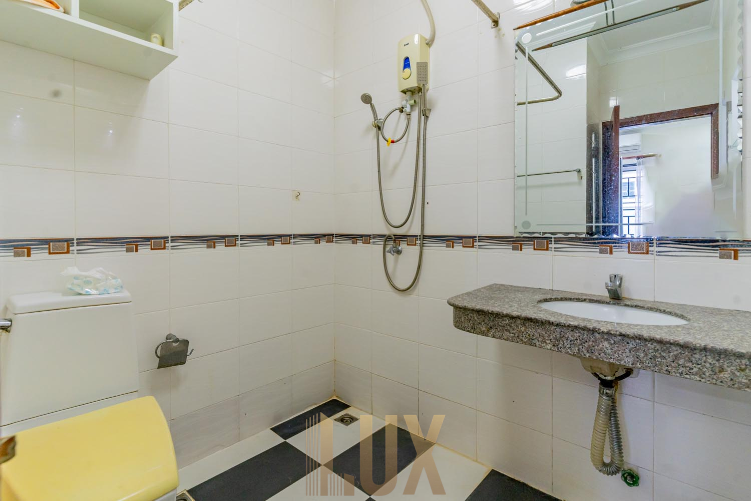 With a total of five (5) bedrooms, this is a supreme choice for family living especially with a large household. There are four (4) bedrooms upstairs and two (2) rooms on the ground floor which can easily be converted into a private living room as well as a maid’s room. You’ll love the wide galley kitchen, which comes with plenty of built-in shelving, and an L-shaped utility counter with integrated exhaust, cooker, oven, and more storage compartments. The sink is also positioned on what is the lower level of a breakfast nook, providing both a light division between kitchen and dining/living space while also ensuring maximum space efficiency. While the unit is currently fitted with basic essentials like the above-mentioned appliances, a sofa set, dining table, desks, and beds, it’s easy to imagine decorating it mid-century modern style to complement the hardwood flooring, monochromatic walls, and granite-texture accents that already give this abode an elegant atmosphere.