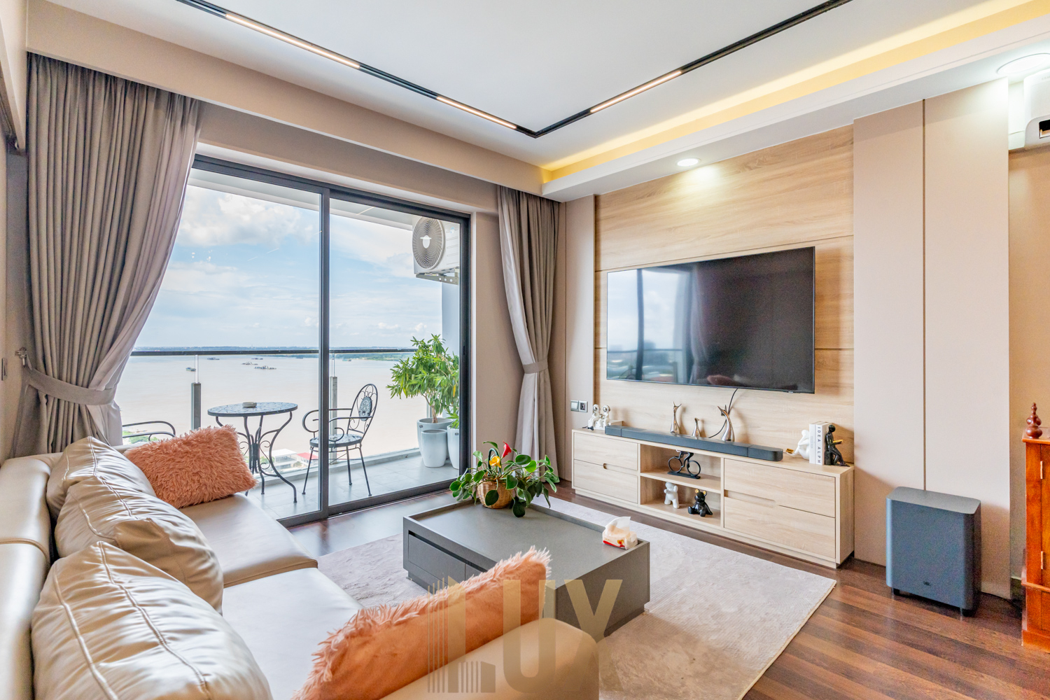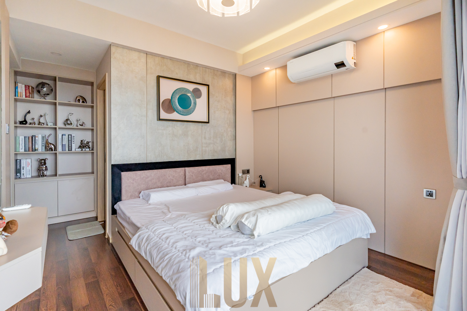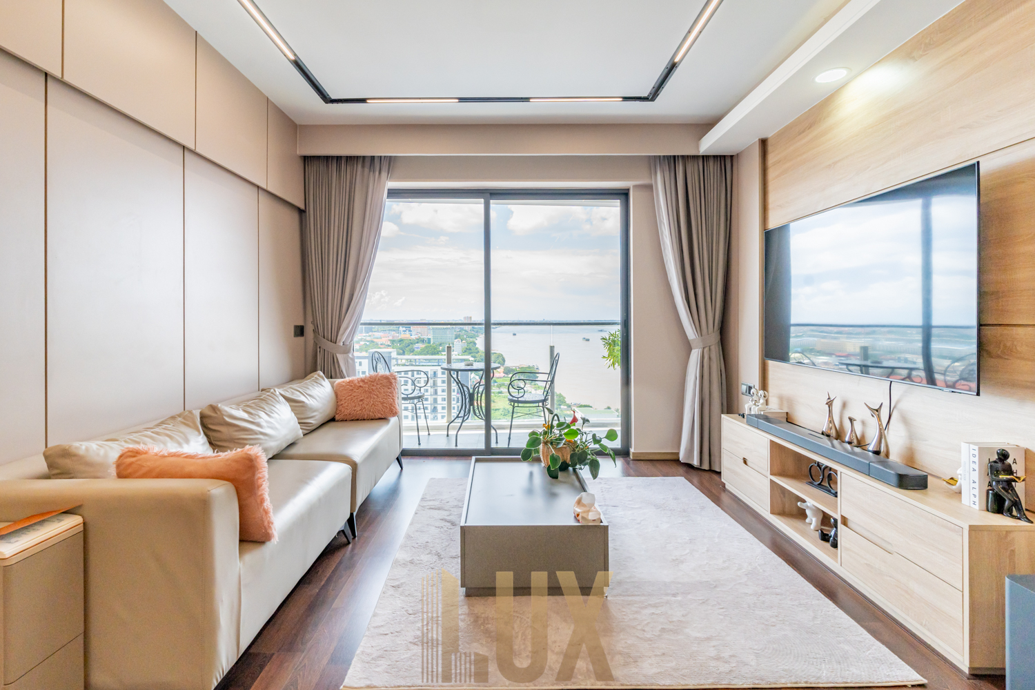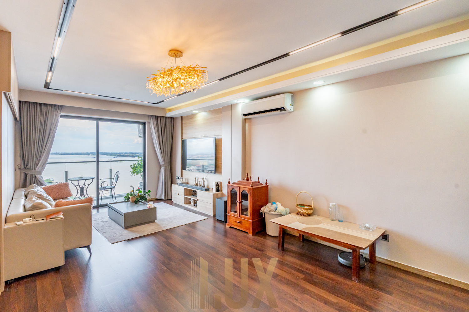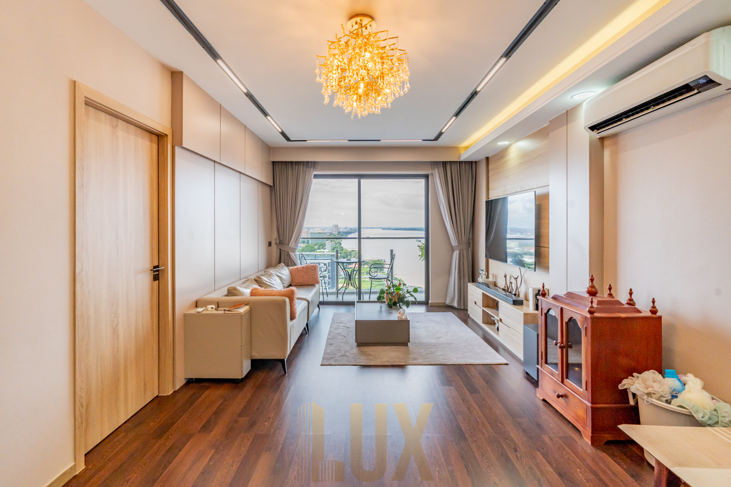 This unit comes with all you’d need for a comfortable urban lifestyle: a built-in kitchen utility counter with an exhaust, cooker, and oven, plus a large refrigerator; a cozy armless sofa; plenty of integrated storage and shelving; a flatscreen TV, and a large bed situated by the balcony. The latter ensures a steady flow of sunlight, illuminating the interior and creating an energizing atmosphere. The bathroom is also well-equipped with a large sink counter and a hot/cold walk-in shower. Moreover, the unit boasts a breathtaking view of the Mekong River. With such a serene landscape and in-building wellness amenities within reach, this would surely be the ideal abode for enjoying a balanced lifestyle.
