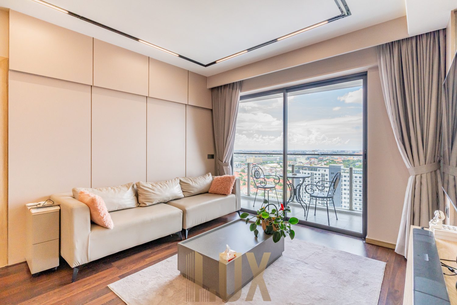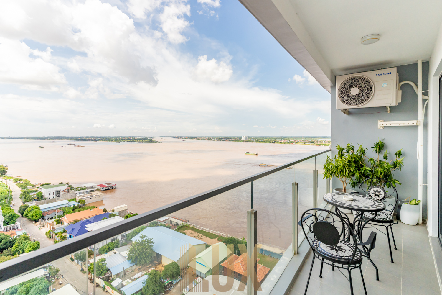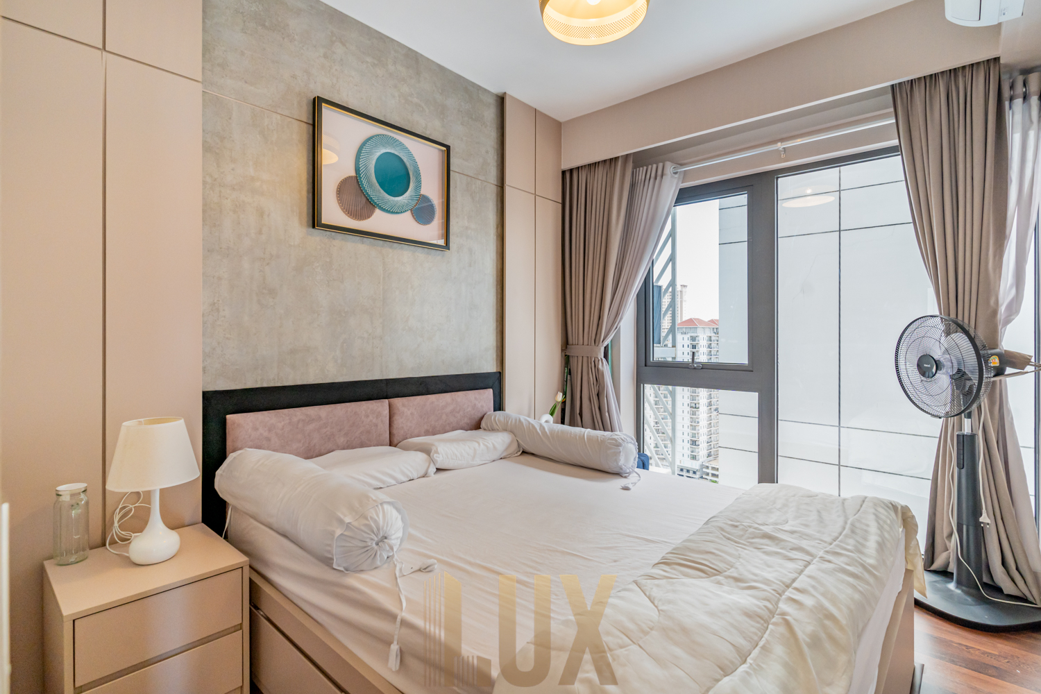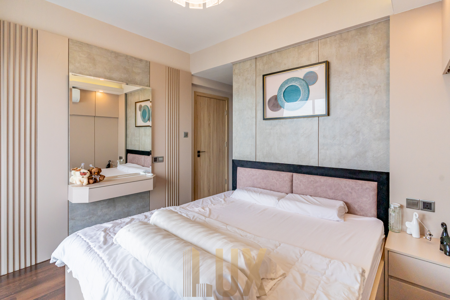 This unit comes with all you’d need for a comfortable urban lifestyle: a built-in kitchen utility counter with an exhaust, cooker, and oven, plus a large refrigerator; a cozy armless sofa; plenty of integrated storage and shelving; a flatscreen TV, and a large bed situated by the balcony. The latter ensures a steady flow of sunlight, illuminating the interior and creating an energizing atmosphere. The bathroom is also well-equipped with a large sink counter and a hot/cold walk-in shower. Moreover, the unit boasts a breathtaking view of the Mekong River. With such a serene landscape and in-building wellness amenities within reach, this would surely be the ideal abode for enjoying a balanced lifestyle.