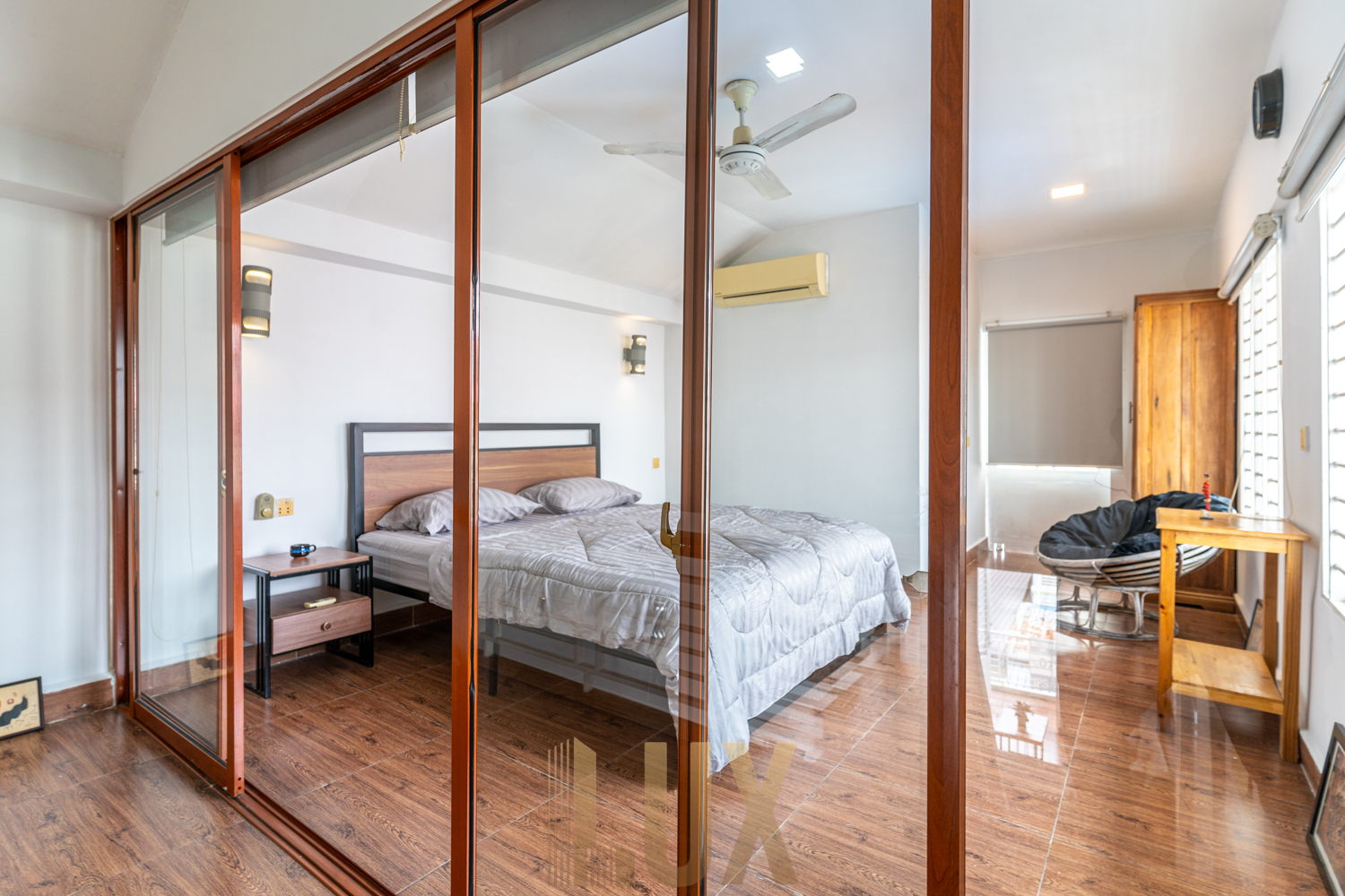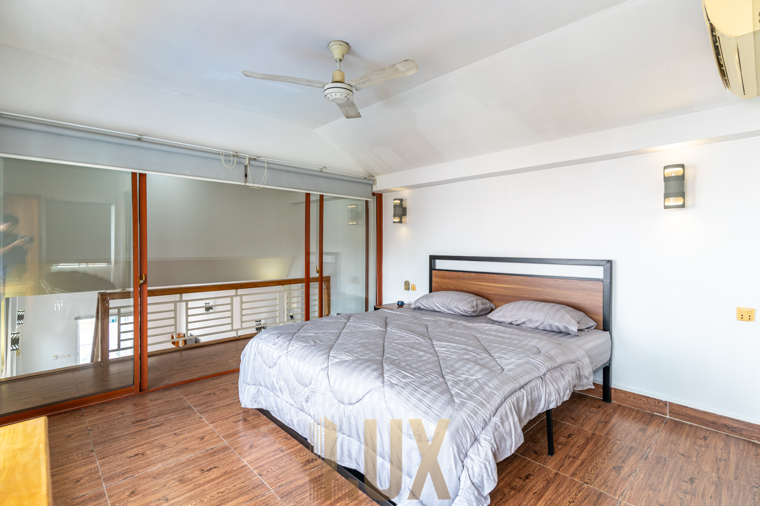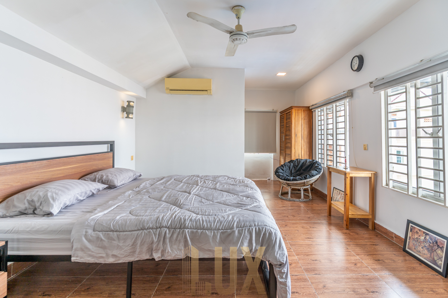 It features quality wooden flooring and whitewashed walls, the remaining interior elements giving off a modern minimalist look. The kitchen is an L-shaped counter featuring a built-in sink, cooker, range hood, and pantry positioned underneath the staircase, while ahead of it you’ll find a four-seater dining set as well as the lounge that comes complete with a mounted flatscreen TV as well as an air-conditioning unit. Both bedrooms are fitted with a queen-sized bed and series of cabinets/dressers, and bathrooms are walk-in shower type. There’s also a spacious balcony, ideal for making the most of the top-floor position of this apartment.