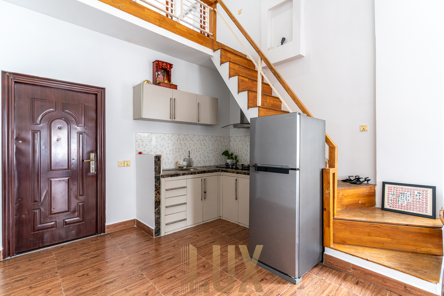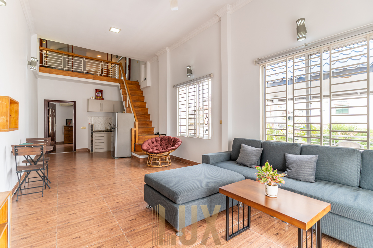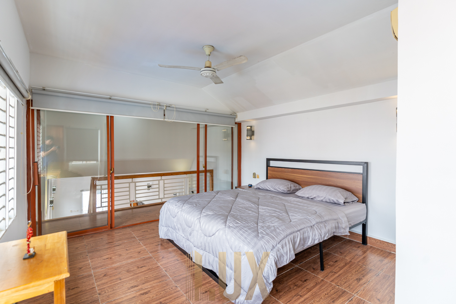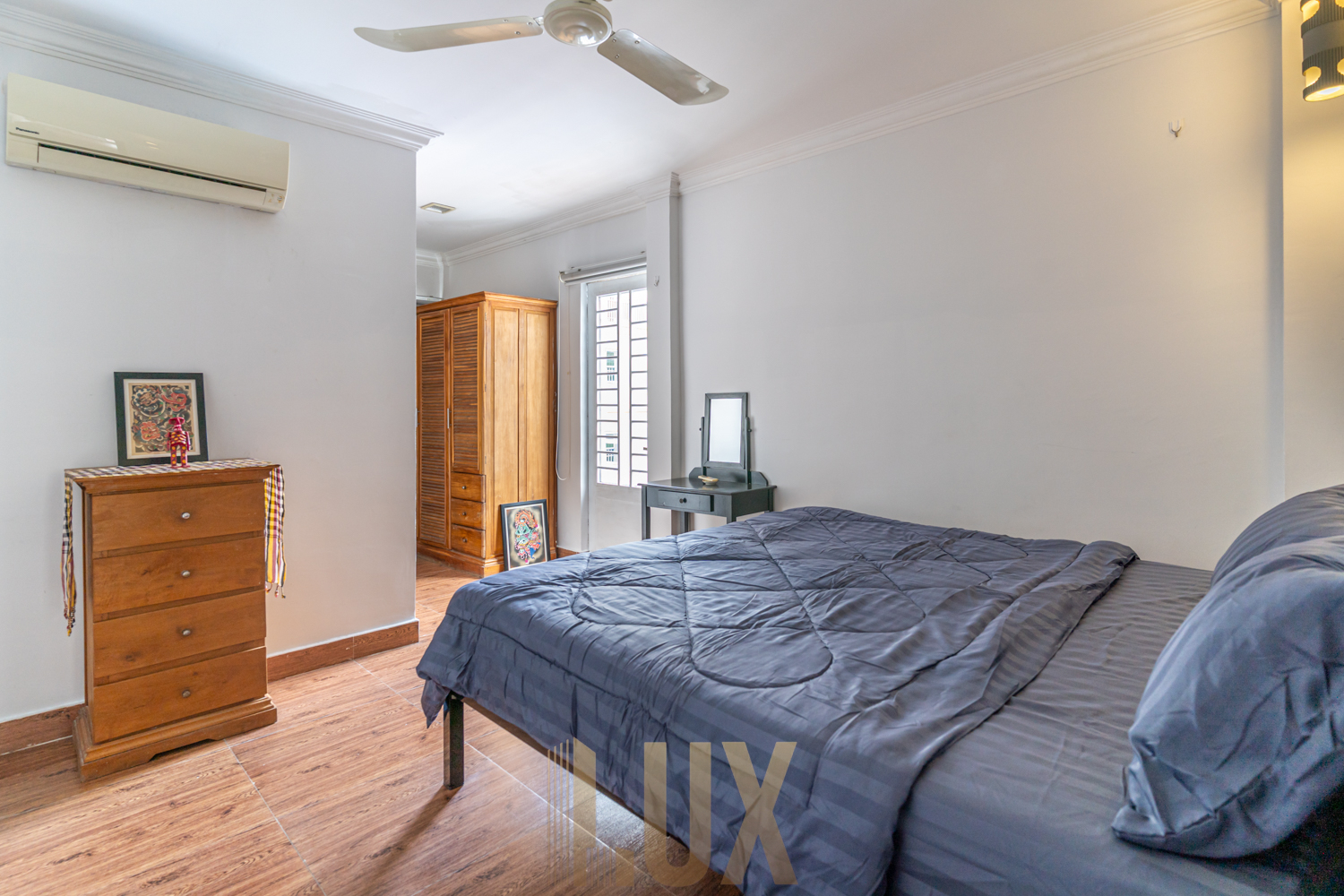 It features quality wooden flooring and whitewashed walls, the remaining interior elements giving off a modern minimalist look. The kitchen is an L-shaped counter featuring a built-in sink, cooker, range hood, and pantry positioned underneath the staircase, while ahead of it you’ll find a four-seater dining set as well as the lounge that comes complete with a mounted flatscreen TV as well as an air-conditioning unit. Both bedrooms are fitted with a queen-sized bed and series of cabinets/dressers, and bathrooms are walk-in shower type. There’s also a spacious balcony, ideal for making the most of the top-floor position of this apartment.