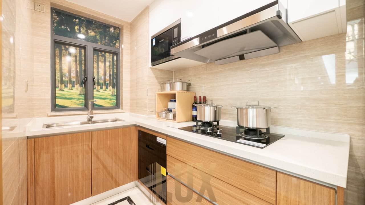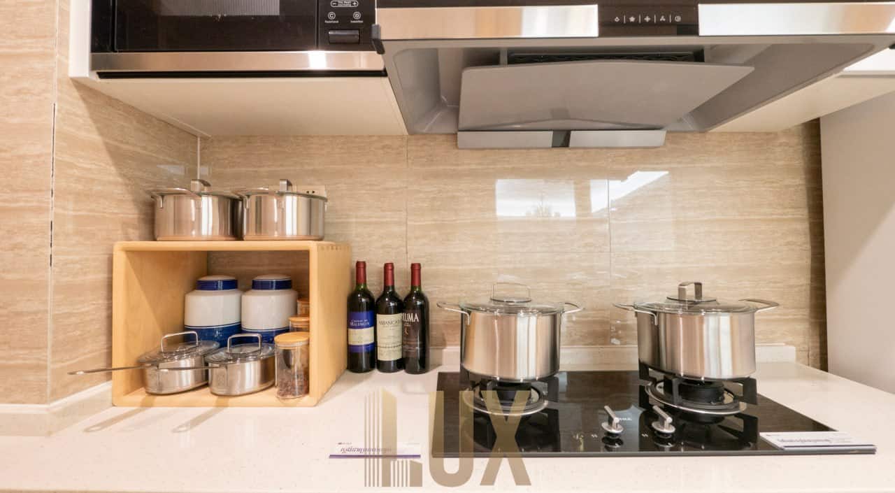 fully equipped kitchen, complete with modern appliances including a microwave, oven, and electric hob. Gather around the elegant dining table to enjoy culinary delights prepared with a nice balcony view.