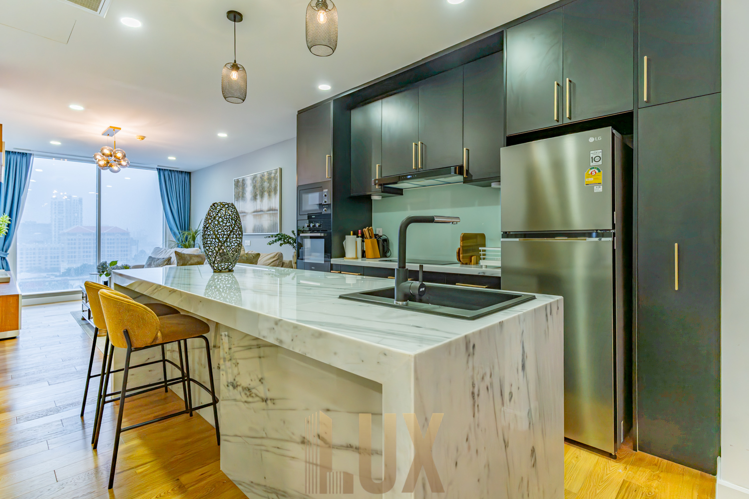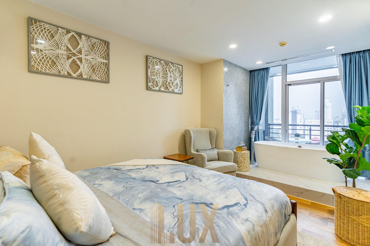 This sleek, single-bedroom unit at The Penthouse in Tonle Bassac used to house two (2) rooms, but has since been converted into this spacious pad perfect for solo living or even for a new couple. As an investment, this unit boasts the efficiency of being fully furnished and having easy in-building access to wellness amenities. Measuring 68 sqm., it contains all anyone would need for a laidback urban lifestyle: a cozy living area for relaxing and entertaining visitors, a comfortable and aesthetically-pleasing kitchen with allotted dining space, a large bedroom with a convenient walk-in closet, a bathroom equipped with hot/cold water, and of course a private balcony.