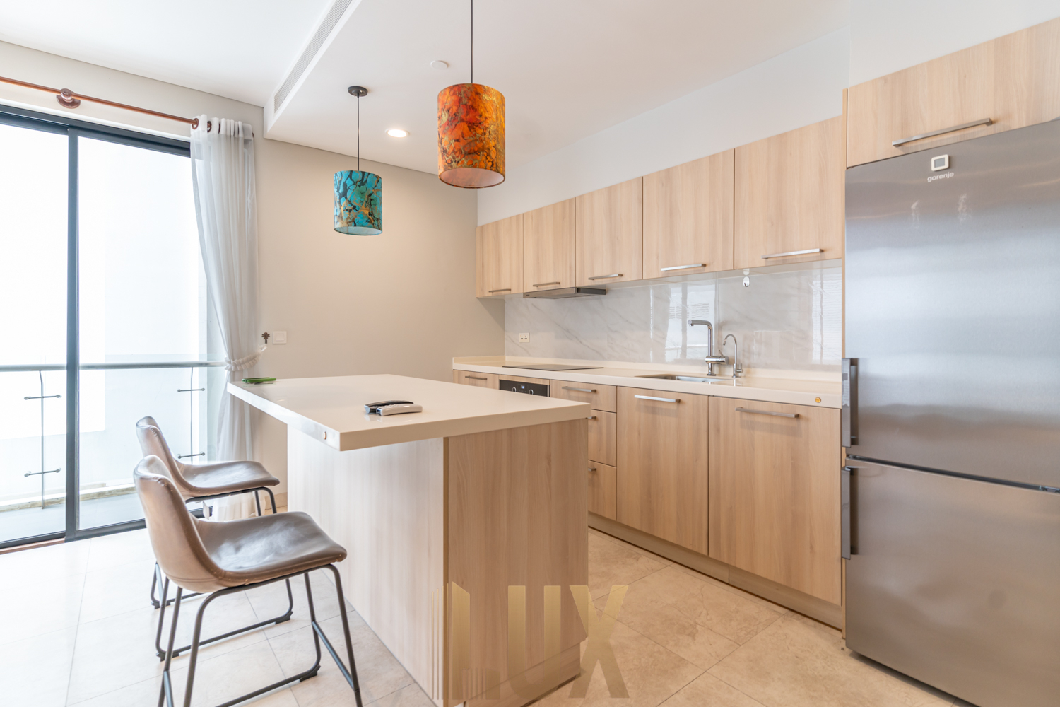 The unit features an open-plan living area that flows into a straight-line kitchen with a built-in dining nook, perfect for relaxed city living. Each bedroom is spacious, complemented by large windows for natural light, while both bathrooms are equipped with hot/cold showers and modern fittings. A private balcony extends from the living space, offering a quiet spot to unwind.