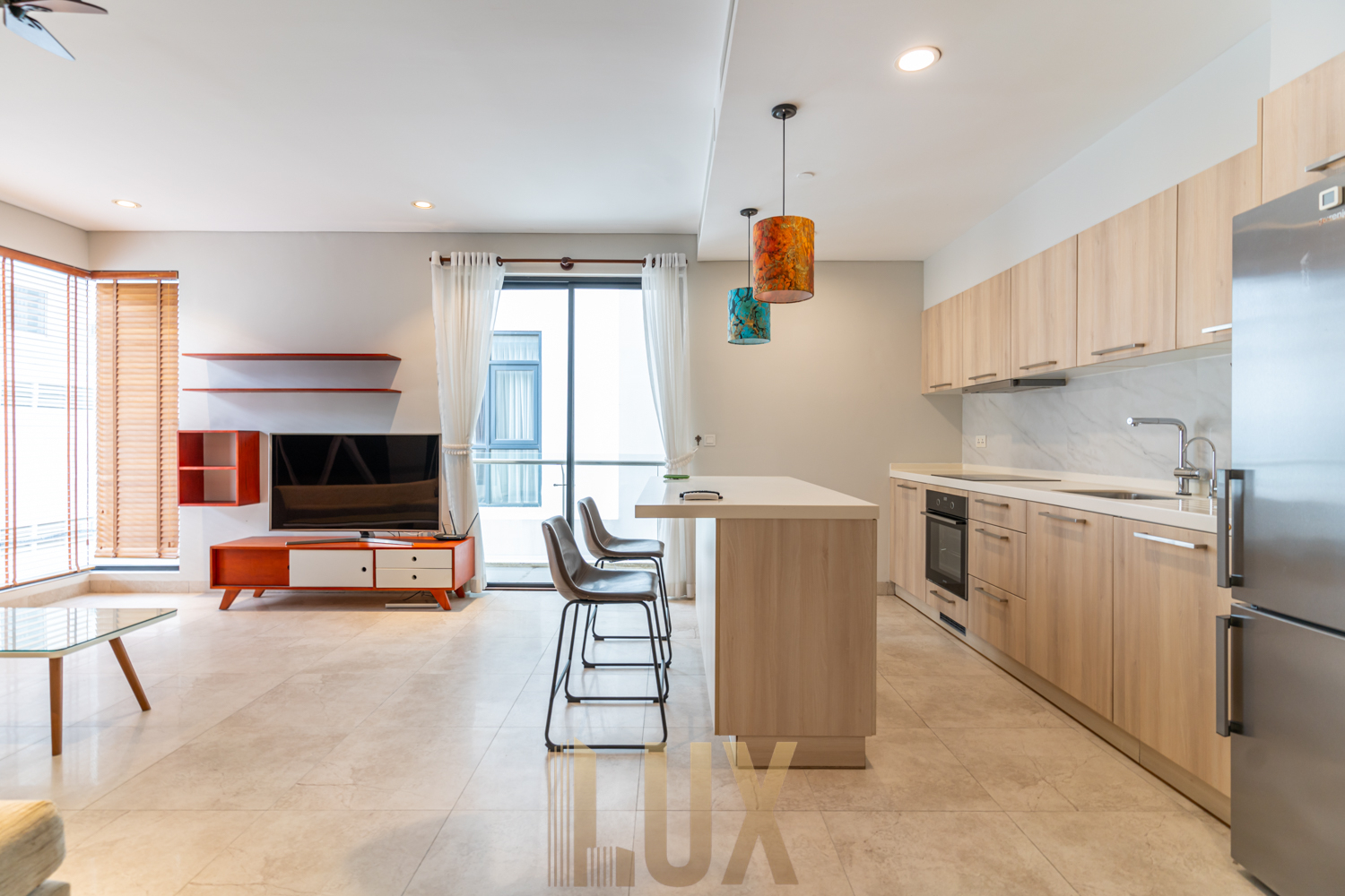 Located in the prestigious Embassy Residences in Tonle Bassac, this fully furnished 2-bedroom, 2-bathroom condo offers a sleek, modern living space with 107 sqm (net area).