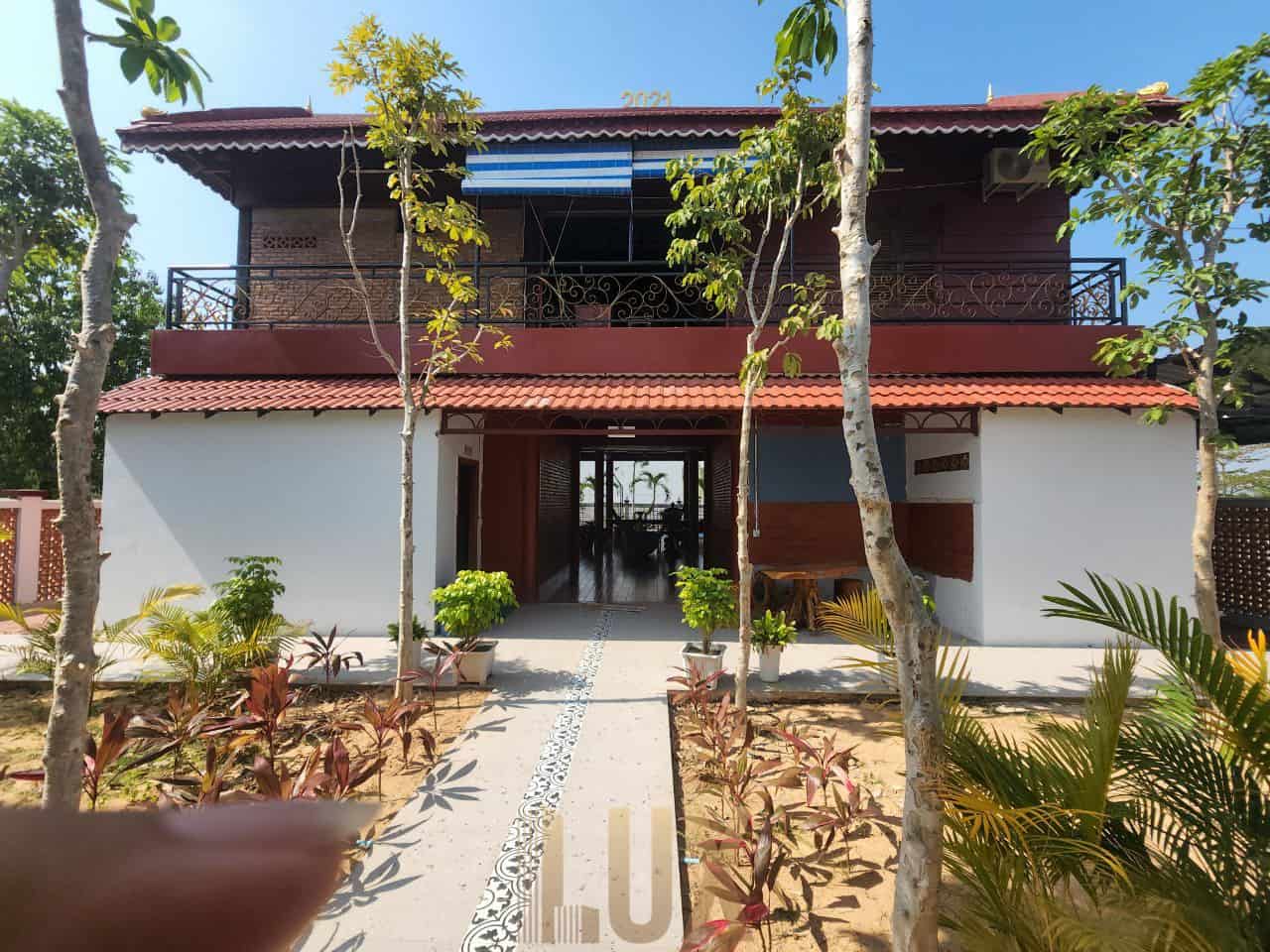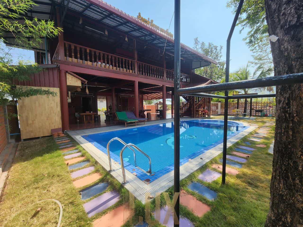 The house boasts not only an impressive wooden design but also modern amenities, such as a swimming pool, landscaped gardens, and ample parking. The location is poised for growth with upcoming infrastructure projects, improving the already accessible routes to central Kampot and beyond. With the increasing demand for land in Kampot, this property represents a significant investment opportunity with the potential for excellent returns.