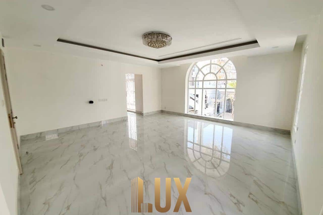 It has 5 bedrooms, 6 bathrooms, 1 huge living room, a kitchen and huge outdoor space for parking.